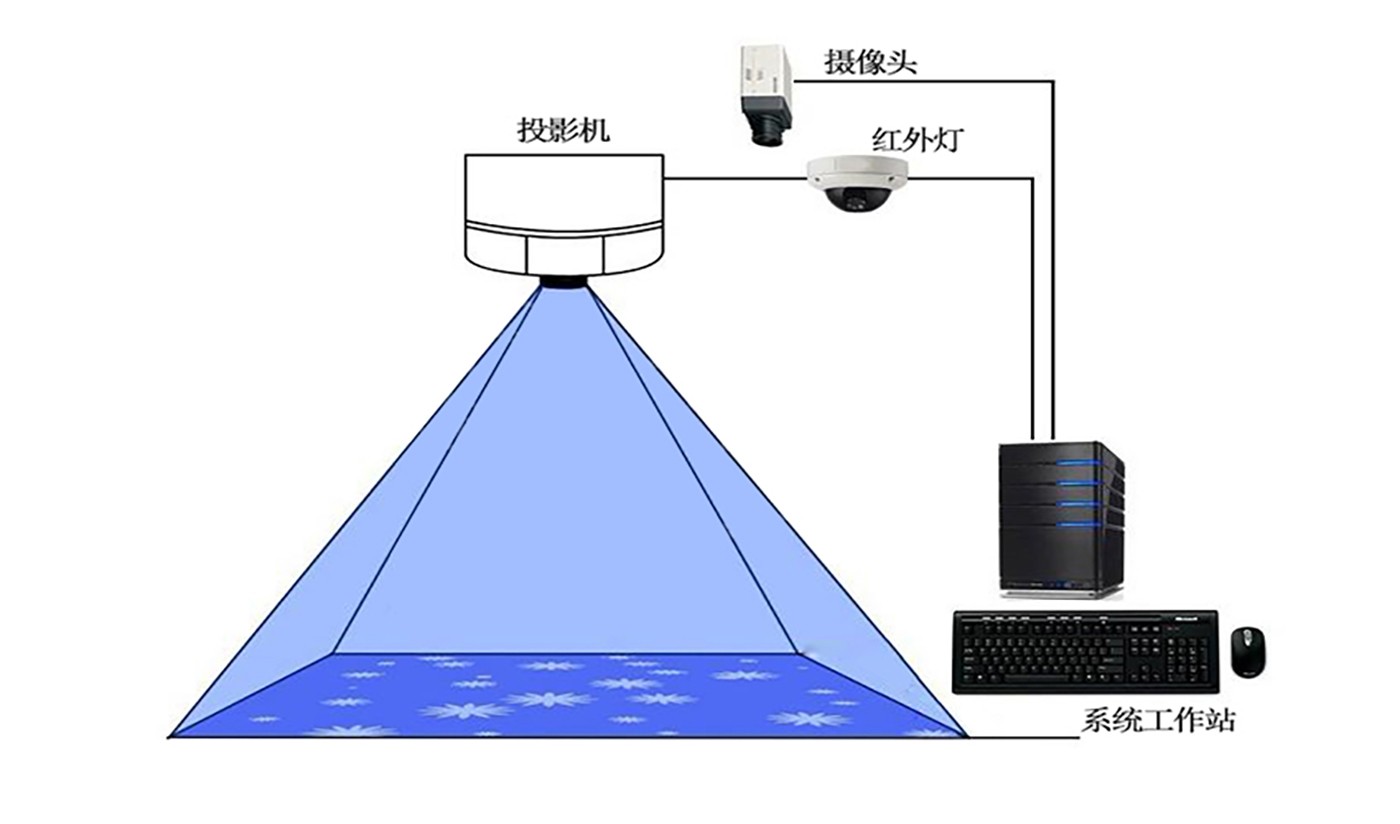 地面互動投影系統(tǒng)是由投影機、攝像機、紅外感應(yīng)器、互動交互軟件、采集識別軟件以及互動內(nèi)容軟件組成。